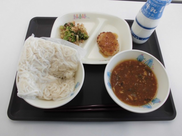 今日の献立は、ソフトめん、牛乳、肉みそソフトめん(汁)、豆腐バーグのおろしがけ、花野菜のおかか和えです。