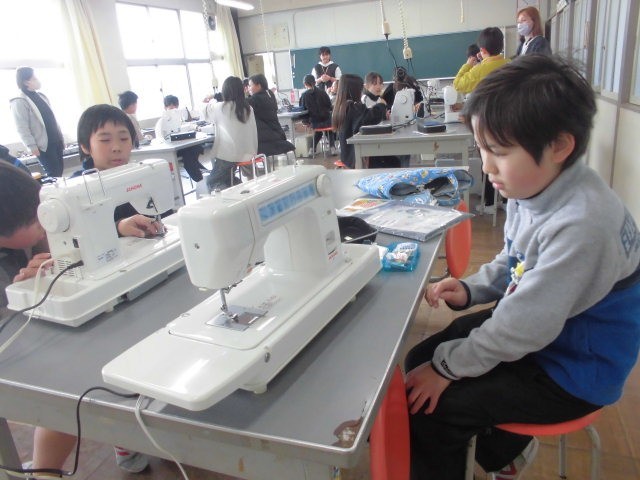 5年生は家庭科。ミシンを使います。エプロンをつくっていきます。