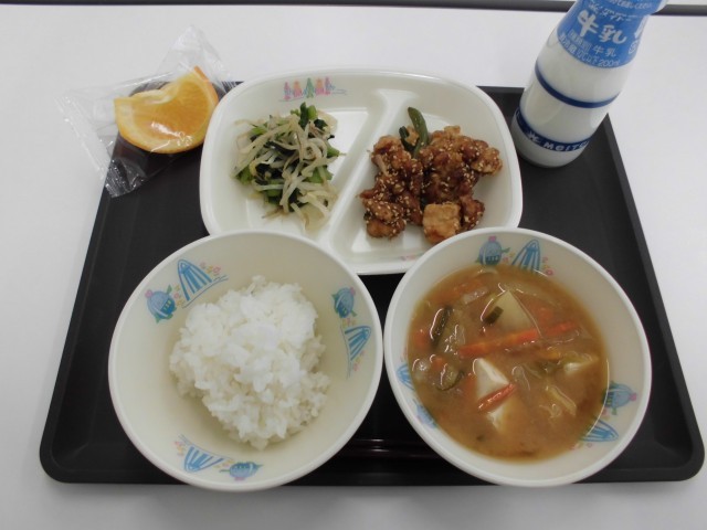 今日の献立は、ごはん、牛乳、とり肉のごまてり、骨太和え、冬野菜たっぷりみそ汁、いよかんです。