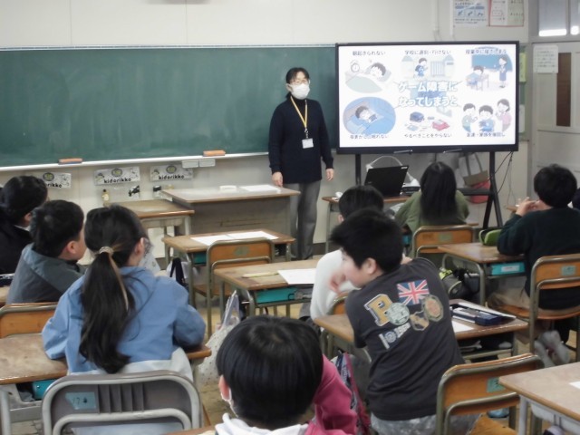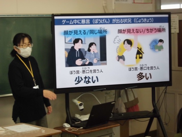 4年生は今日の6時間目に、2組でICT支援員による情報モラル教室を行いました。インターネットゲームでのコミュニケーショントラブルや、課金トラブル、メッセージアプリでの言葉のトラブルなどについて、事例をもとに、どう対処すればいいのかを考える時間となりました。お家でもぜひ話題にしていただき、ゲームやスマートフォンを楽しく安全に使えるような、ご家庭でのルールを話し合っていただければと思います。なお、1組は17日(火)に実施する予定です。