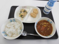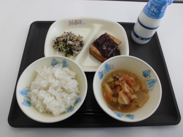 今日の献立は、ごはん、牛乳、関東煮、絹厚揚げの肉みそがけ、赤じそ和えです。