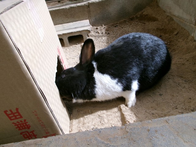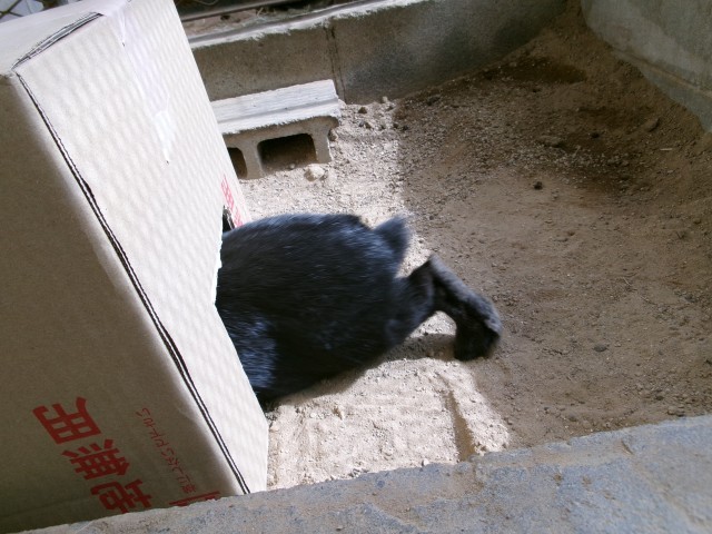 段ボールで作ったトンネルをくろみつにプレゼントしました。さっそく出たり入ったりして遊んでいました。
