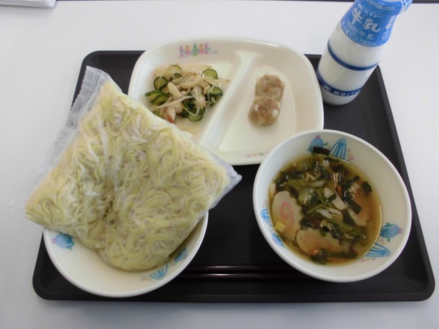 今日の献立は、中華めん、牛乳、しょうゆラーメン(汁)、ポークシューマイ、もやしとちくわの中華和えです。