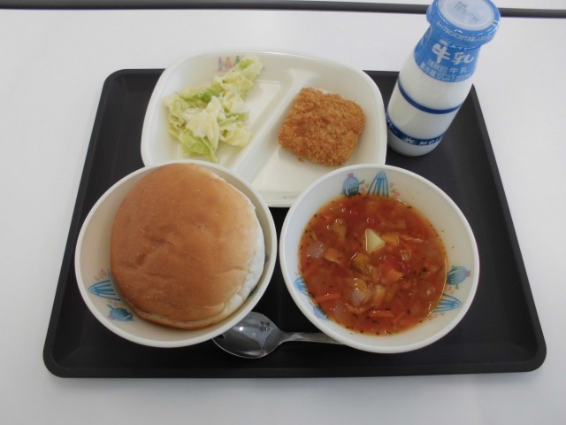 今日の献立は、サンドイッチバンズパン、牛乳、フィッシュバーガー(フィッシュフライ/キャベツのタルタルソース和え)、ミネストローネです。