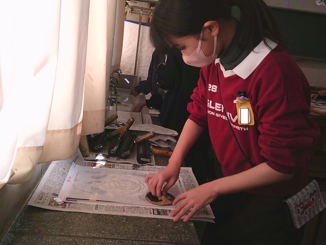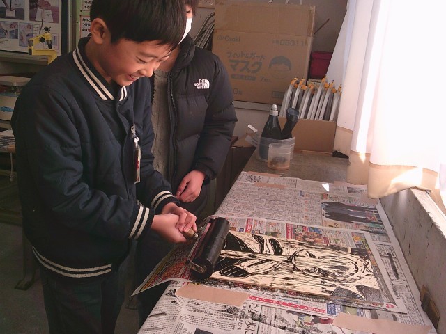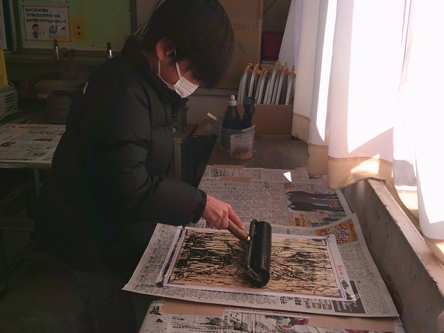 版画が完成に近づいてきました。今日は、インクをつける作業が中心でした。彫刻刀で彫った作品にインクをつけ、紙を押し当てると、きれいに写し出されました。次回は、絵の具で着色する作業を中心にすすめていきます。