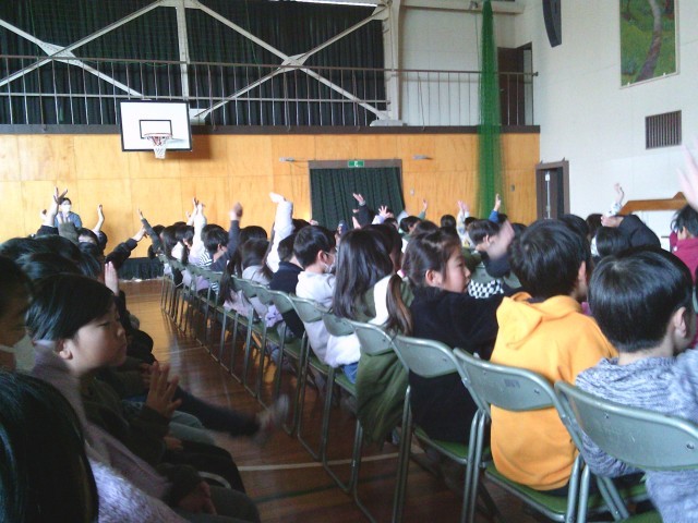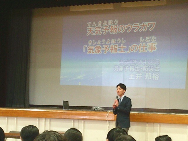 今日は、気象予報士の土井邦裕さんによる生き方講演会「天気予報のウラガワ・気象予報士のお仕事」がありました。雲の名前をたくさん教えてもらったり、気象予報士の仕事などについて教えてもらったりしました。2年生は、七色に光る「彩雲」がとても気に入っていました。