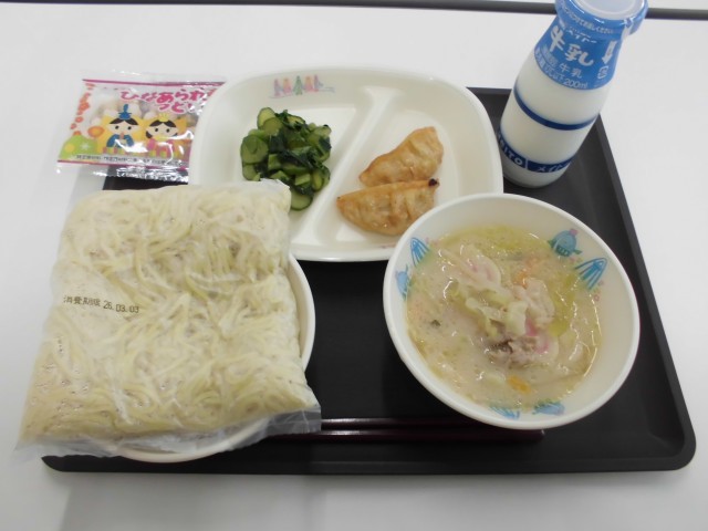 今日の献立は、中華めん、牛乳、とん骨ラーメン(汁)、揚げギョーザ、チンゲンサイのナムル、ひなあられです。