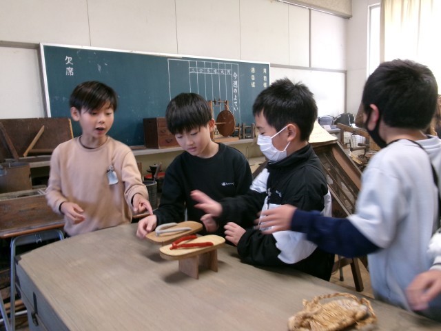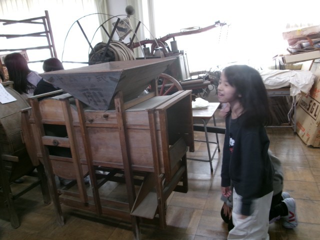 本校には、地域の方が寄贈してくださった昔の道具を展示している教室があります。3年生が、社会科の学習の一環で見たり、触れたりしました。