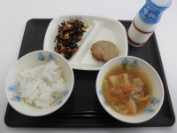 今日の献立は、ごはん、牛乳、さばの塩焼き、ひじきのそぼろ煮、沢煮わんです。