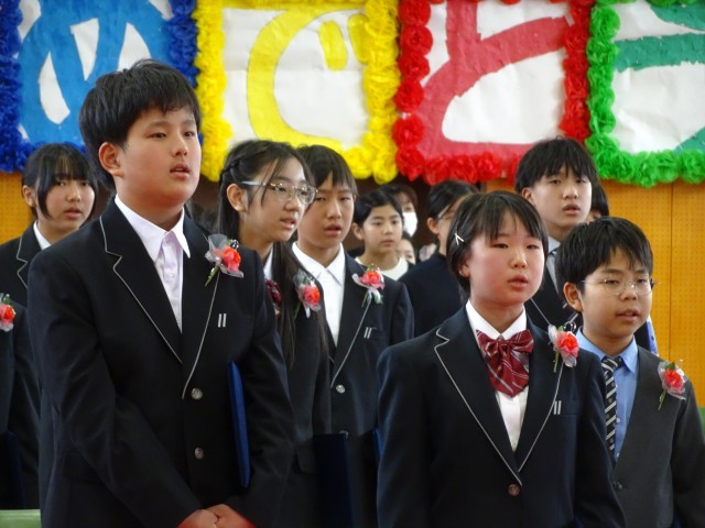 本日、無事に卒業式が終了しました。門出の日を迎えた51人の子どもたちが、緊張しながらも晴れやかな表情で卒業証書を受け取りました。式が終わった後も、なんだか離れがたい雰囲気に包まれていて、担任の先生と子どもたちの絆の強さ、そして子どもたちの学校が好きという思いを感じました。