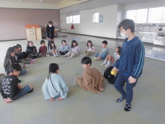 1年生は交流学級でお楽しみ会です。「ハンカチ落とし」だれにしようか考え中でした。