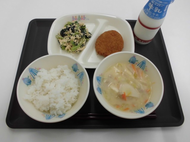 今日の献立は、ごはん、牛乳、ポテトコロッケ、こまつなのささみ和え、豆乳入りみそ汁です。