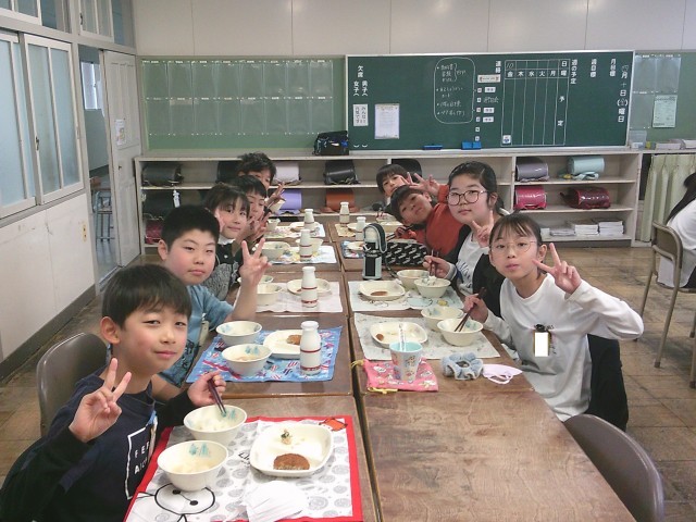 初めての給食【4月10日(金)5年生】 公開日 2026/04/10 更新日 2026/04/10 5年 5年生が始まって初めての給食でした。準備をてきぱき行い、楽しい給食の時間を過ごしました。さすが5年生です!