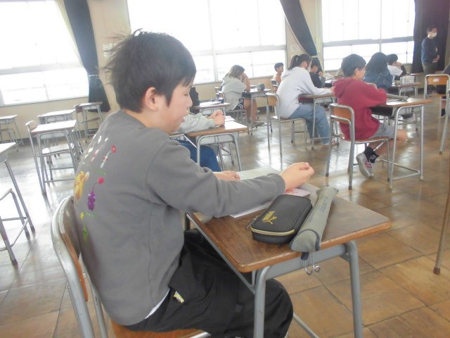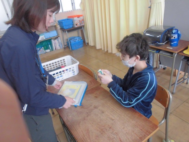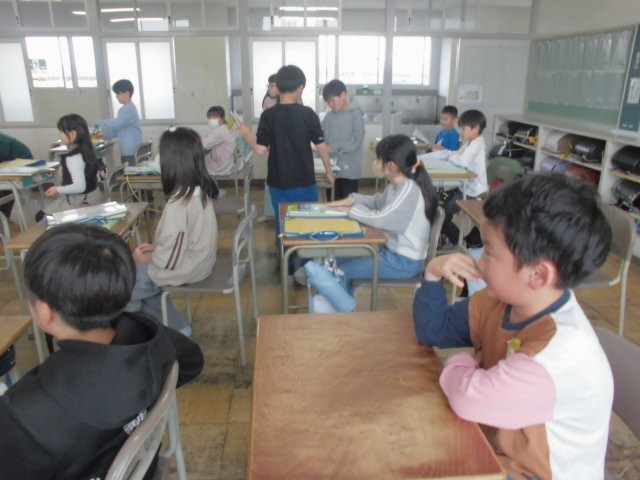 5年生は交流学級での時間です。社会の教科書等が配られていました。