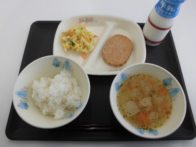 今日の献立は、ごはん、牛乳、ボロニアステーキ、春キャベツのサラダ、かぶのコンソメスープです。