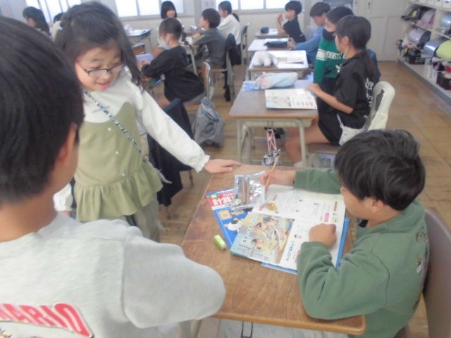 4年生は算数の問題の解き方を相談し合っているところです。