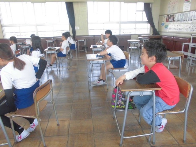 5年生は音楽。「ゆうやけこやけ」と「どんぐりころころ」の歌合戦をしていました。