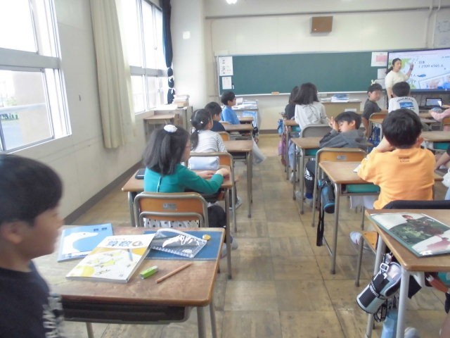 5年生は理科です。理科室にいます。実験とか楽しみですね。