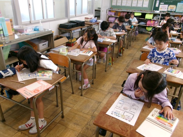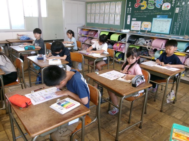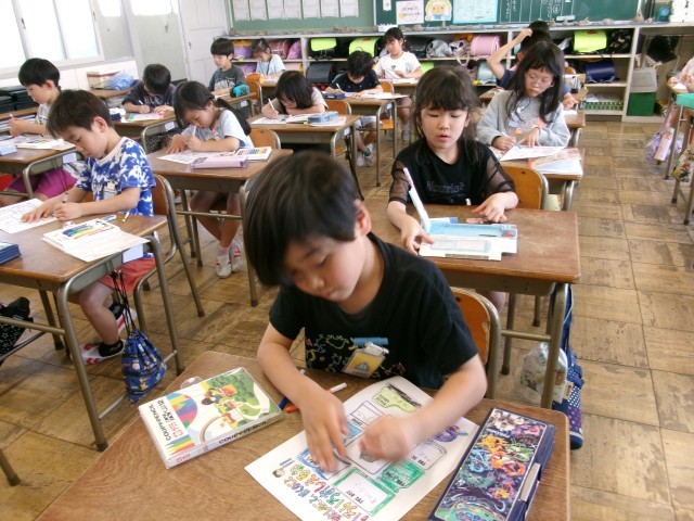 自分を知ってもらい、友達を知るための自己紹介カード。自分の好きな遊び、好きな食べ物、好きな動物なども書いています。きれいに色を塗って完成しました。