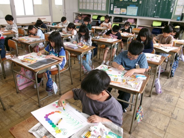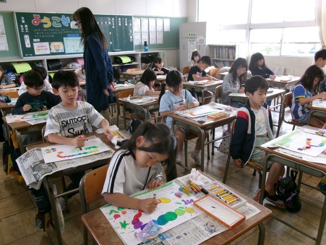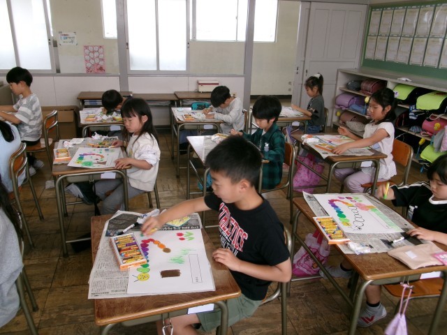 自分であおむしを描いて、体をクレヨンでぬりました。今日は、「緑と青」や「紫と赤」など色を混ぜてできる色を楽しみました。