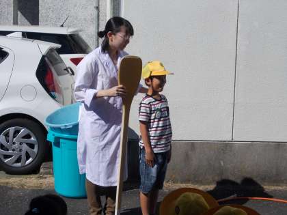 しゃもじもとても大きくて、みんな目を丸くしていました。子どもたちは、自分たちのために、おいしい給食を作っていただいていることがよくわかり、とても勉強になりました。