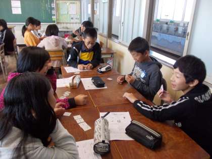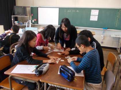 その後、グループごとに同じ商品のカードを集めるゲームをしました。楽しく英語に親しむことができました。