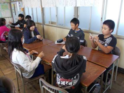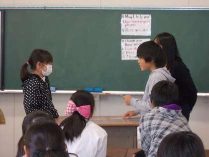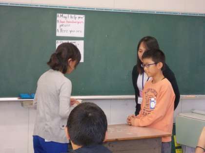 ハンバーガーショップで♪ その1 【10月15日(木)の6年生】 公開日 2015/10/15 更新日 2015/10/15 6年 英語では、買い物場面の英会話の練習をしています。今日はハンバーガーショップに行き、店員さんとお客さんになってやりとりをしました。