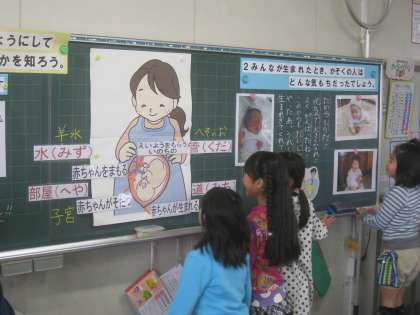 今、生活科の学習で「「すてき自分ものがたり」と称して自分の成長アルバムを写真や絵と言葉で作っています。また、昨日は『赤ちゃんが 生まれたよ!』の授業を行いました。授業の初めに、赤ちゃんの産声をみんなで聞きました。お母さんのおなかの中で大きくなっていく様子や赤ちゃんを守る仕組みを簡単に学習しました。また、赤ちゃんのはじめの大きさ、生まれるときの赤ちゃんの大きさを実際に手にしたり、おなかに巻いたり、いろいろ体験をしました。赤ちゃんを迎えたときの家族の人たちの気持ちを考えるときは、一人一人の目が輝いていました。家族の人に見守られて大きくなってきたことを実感することができた子どもたち。アルバムの中の写真は、本当に食べてしまいたいくらいの可愛い子どもたちが写っていました。