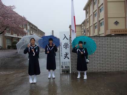始業式はあいにくの雨となってしまいました。隣の浅井中学校では入学式が行われましたが、本校卒業生が傘をさしながら記念撮影をしていました。