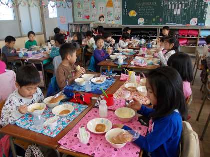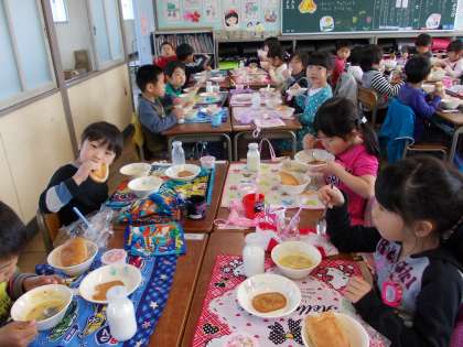 初めての給食【4月11日の1年生】 公開日 2016/04/11 更新日 2016/04/11 1年 入学して初めての給食でした。給食当番の仕事の仕方を学習しました。今日の献立のコーンクリームスープがおいしくて、空っぽになりました。お祝いデザートもおいしかったです。