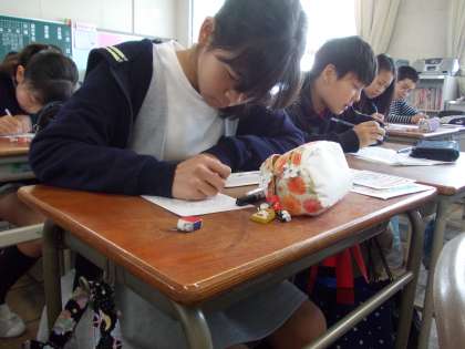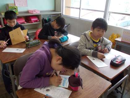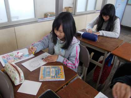 1年生へ【4月12日(火)の6年生】 公開日 2016/04/12 更新日 2016/04/12 6年 15日の1年生を迎える会で渡すペンダントを作りました。1年生が喜んでくれるように、丁寧に色塗りをしました。