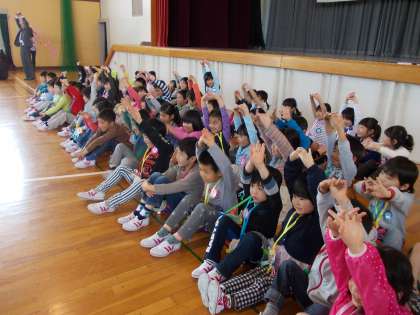 1年生を迎える会 その2【4月15日(金)の1年生】 公開日 2016/04/15 更新日 2016/04/15 1年 各学年の出し物を楽しく見せてもらいました。一緒に歌を歌ったり、動作をしたりしました。