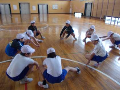体育の準備運動をしています。怪我なく、楽しく体育ができるように、準備運動はとっても大切だよね。