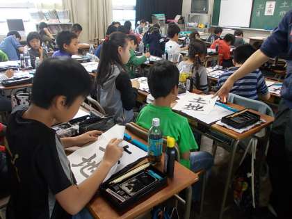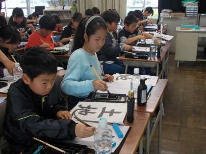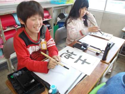 書写の時間です。筆づかいの練習をしてから、手本をじっくり見ました。筆の運び方、注意するところなど手本に書き込んでから書き始めました。