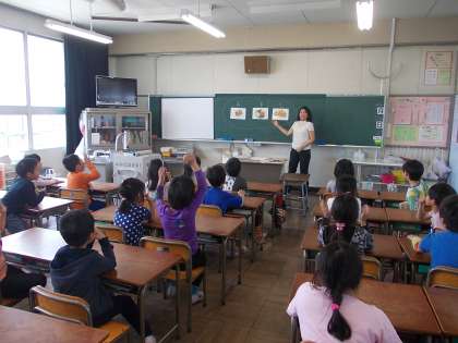 英語活動スタート♪ その2 4月26日(火)の2年生 公開日 2016/04/26 更新日 2016/04/26 2年 そのあとALTの先生の出身地や好きな食べ物などについて、クイズを交えて楽しく教えてもらうことができました。