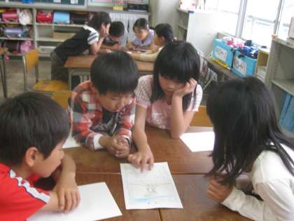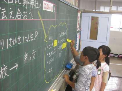 3年生バージョン町探検のお知らせ会【4月27日(水)の3年生】 公開日 2016/04/27 更新日 2016/04/27 3年 先日、大日比野神社に探検に行きました。お気に入りの場所や気になったところを友だちに伝えました。4人ずつの少人数でおこないました。明日は、実物投影機を活用して、全体の場で「ここ見てポイント!」を発表する予定です。