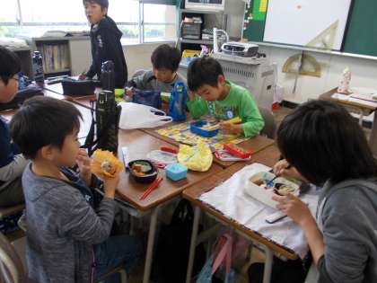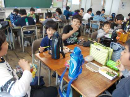 今日は遠足が雨で延期になってしまいました。そのかわり、ペアでふれあい会食がありました。みんなで仲良く、おいしくお弁当を食べました。ペアの1年生のお弁当のひもをほどいてあげたり、はしを落とした子について洗いに行ってあげたりと、優しい6年生の姿がありました。