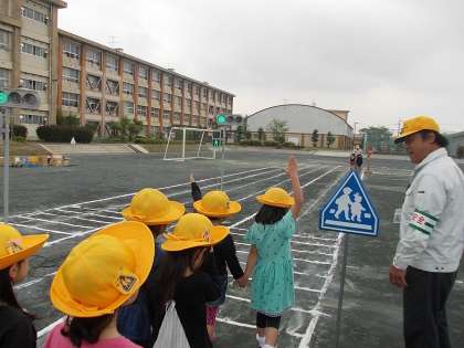 (中)交通安全教室では、1・2年生は安全な横断の仕方について教えてもらいました。