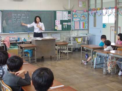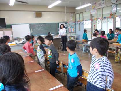 初めての英語活動【5月9日(月)の1年生】 公開日 2016/05/09 更新日 2016/05/09 1年 初めて英語活動をしました。今日は、挨拶の仕方や先生の名前を教えてもらいました。先生の好きな動物や食べ物も教えてもらいました。