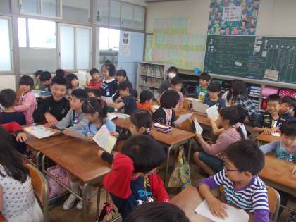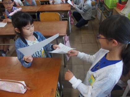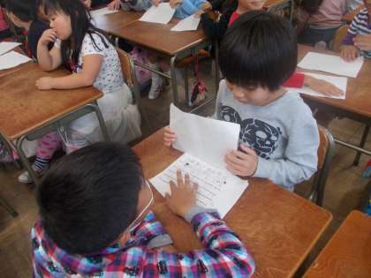 今日は、「ふれあい遠足」のペアの子とお礼のお手紙交換をしました。「一緒に連れていってくれてありがとう」「また遊ぼうね」などと会話しながらお礼を伝え合うことができました。