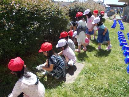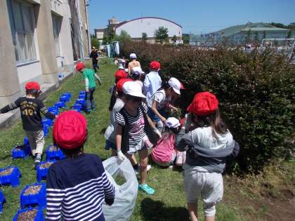 今日は、全校草取りの日でした。みんなで力を合わせて草取りをしました。少しは、きれいになったかな。