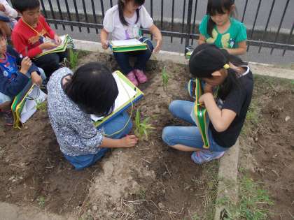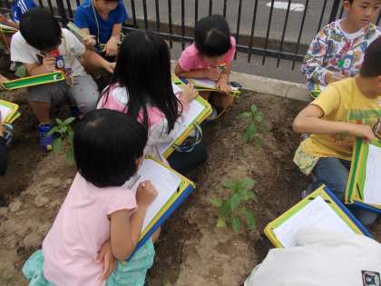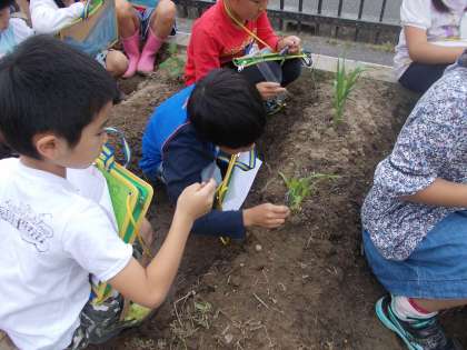 今日は、きゅうり、えだまめ、なす、ピーマン、とうもろこしの苗の観察をしました。