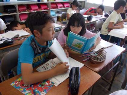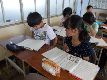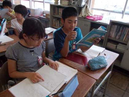 国語の時間に、感想の発表をしました。隣の席の子と感想を伝え合いました。