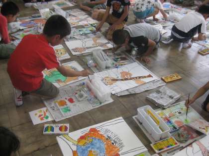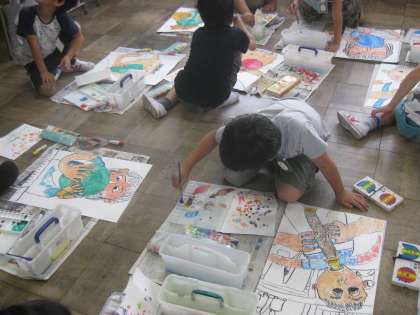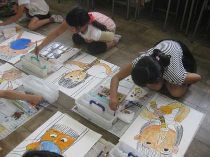 写生会・・・もうすぐ完成! 【5月25日(水)3年生】 公開日 2016/05/25 更新日 2016/05/25 3年 写生会の絵を作成中です。「○○をしている自分」「○○をしている友だち」をテーマに描いています。リコーダーを持つ手、指にポイントを置いて、大きく描きます。交代でモデルになりました。彩色では、水加減や筆の使い方に気をつけて、丁寧に作業をしています。もうすぐ完成です。すてきな作品が仕上がりそうで、楽しみです。