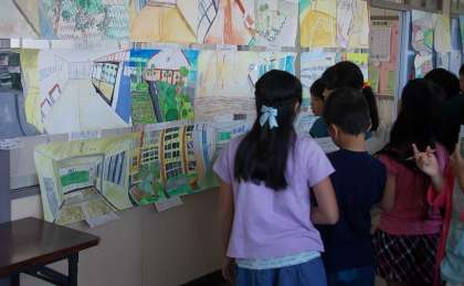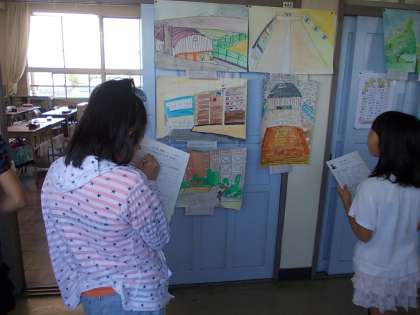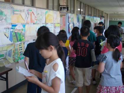 写生会の絵が完成しました。みんなの絵をじっくり見て、お気に入りの絵を見つけました。「色の塗り方が上手だね。」「細かいところまでかけているね。」などと、友達の作品の良いところを見つけていました。