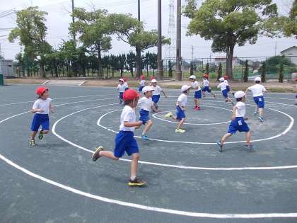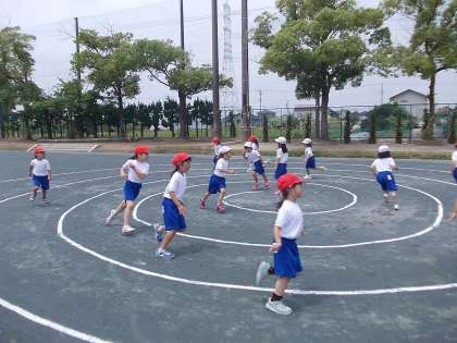 走り遊び 【6月8日(水)の1年生】 公開日 2016/06/08 更新日 2016/06/08 1年 1年生の体育で、走り遊びをしました。ラインに沿って、グルグル走りました。円に沿って走るため、見た目以上に長い距離を走ることができました。