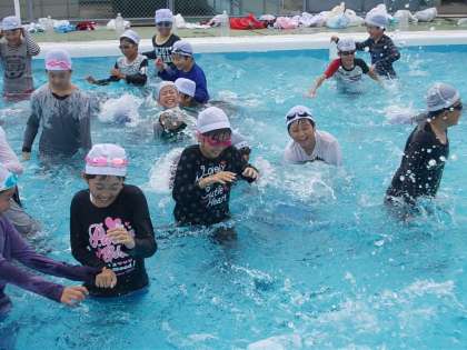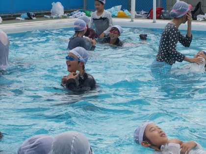 着衣泳【6月14日(火)の5年生】 公開日 2016/06/15 更新日 2016/06/15 5年 服を着て水の中を歩いたり泳いだりしました。服を着ていると重くて動きにくいことが分かりました。ペットボトルを抱えて浮く練習もしました。