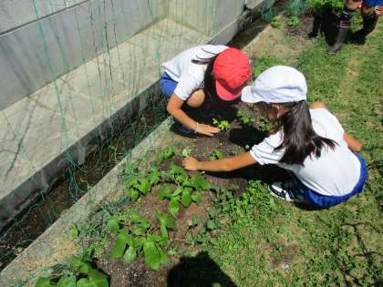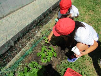 教室で育てていた「アサガオ」を、緑のカーテン用に校舎の南側に植え替えました。