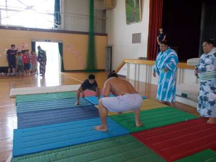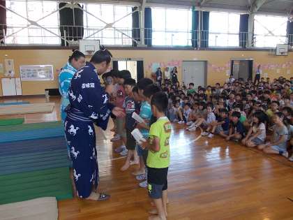 おすもうさんはすごいな!【6月27日(月)の4年生】 公開日 2016/06/27 更新日 2016/06/27 4年 荒汐部屋のおすもうさんたちが、浅井中小学校にやってきました。 4年生からも、わんぱく相撲大会に参加する児童が、挑戦をしました。 最後は担任も挑戦し、玉砕・・・ 「先生でも勝てないんだ。」おすもうさんってほんとに強いですね。 たくさん食べて、たくさんけいこをしているからだね。