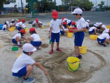 生活科の学習で砂遊びをしました。グループで協力して、山を作ってトンネルを掘ったり、川を作ったりして楽しく学習することができました。
